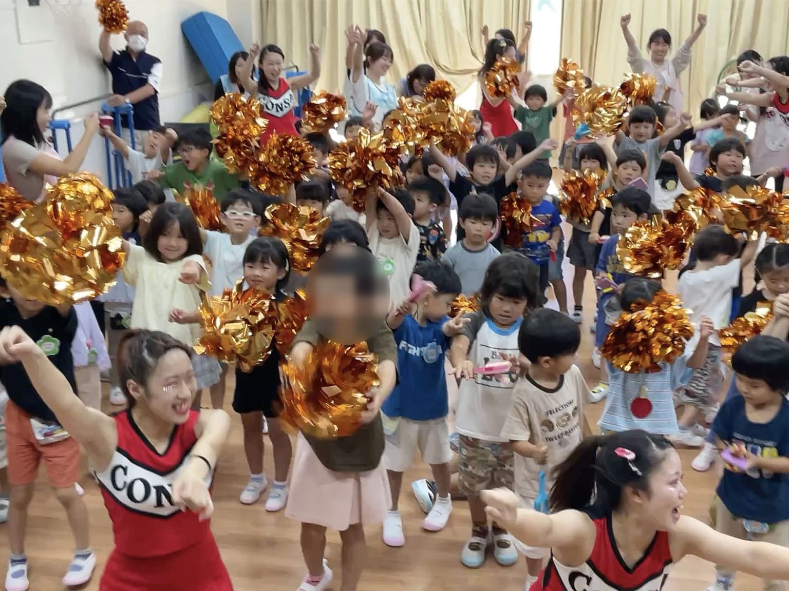 そして最後はメンバーが演舞の時に使っているポンポンや鳴子を園児のみなさんにも持ってもらい、覚えた振りを踊ってみました。園児のみなさんとともに先生方もノリノリで一緒に踊っていただくなど、会場が一体となりとてもたのしく踊ることができました!