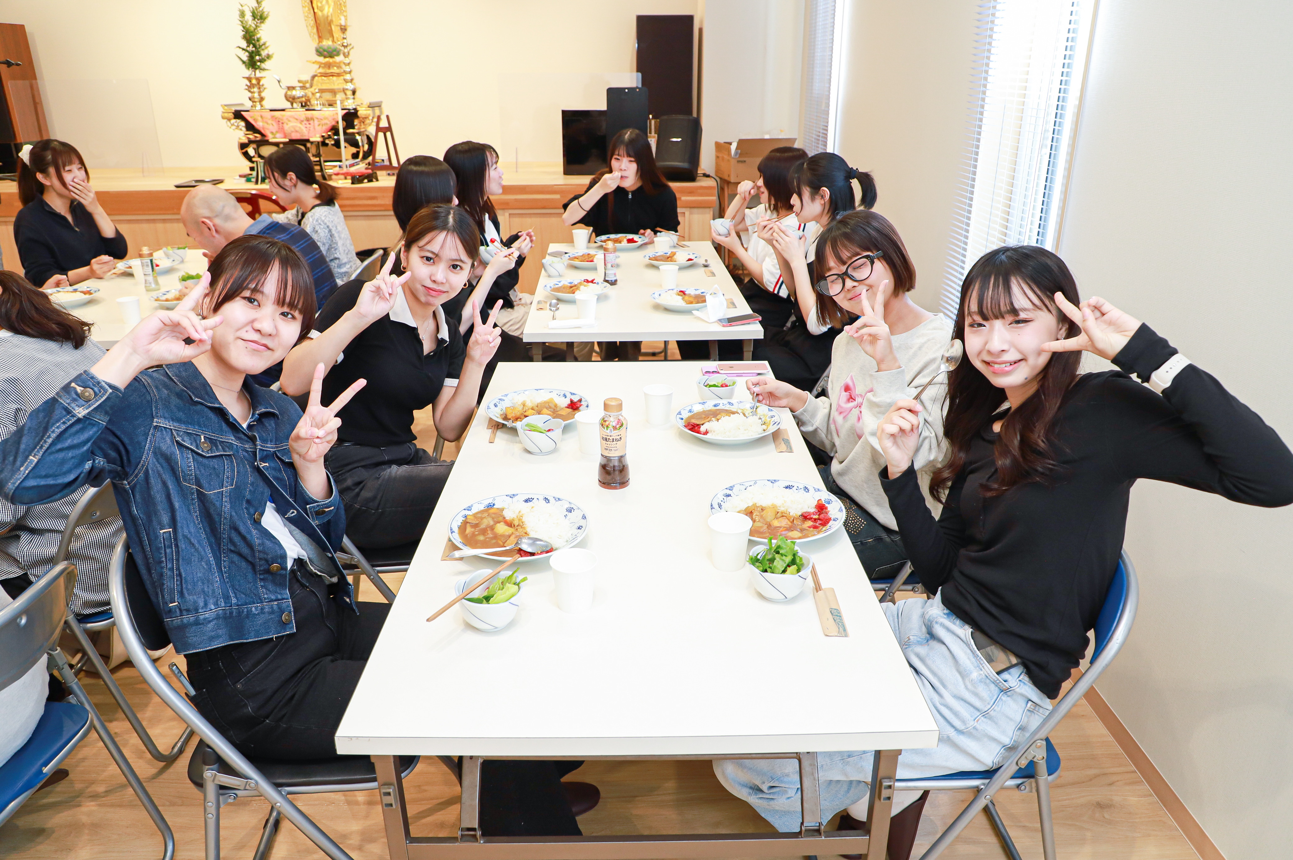 学生たちは、お焼香の作法やお経の読み方を教えていただいた後、肉の代わりに油揚げの入った特製精進カレーを昼食としていただきました。これらの体験を通し、さまざまな気づきを得ることができました。