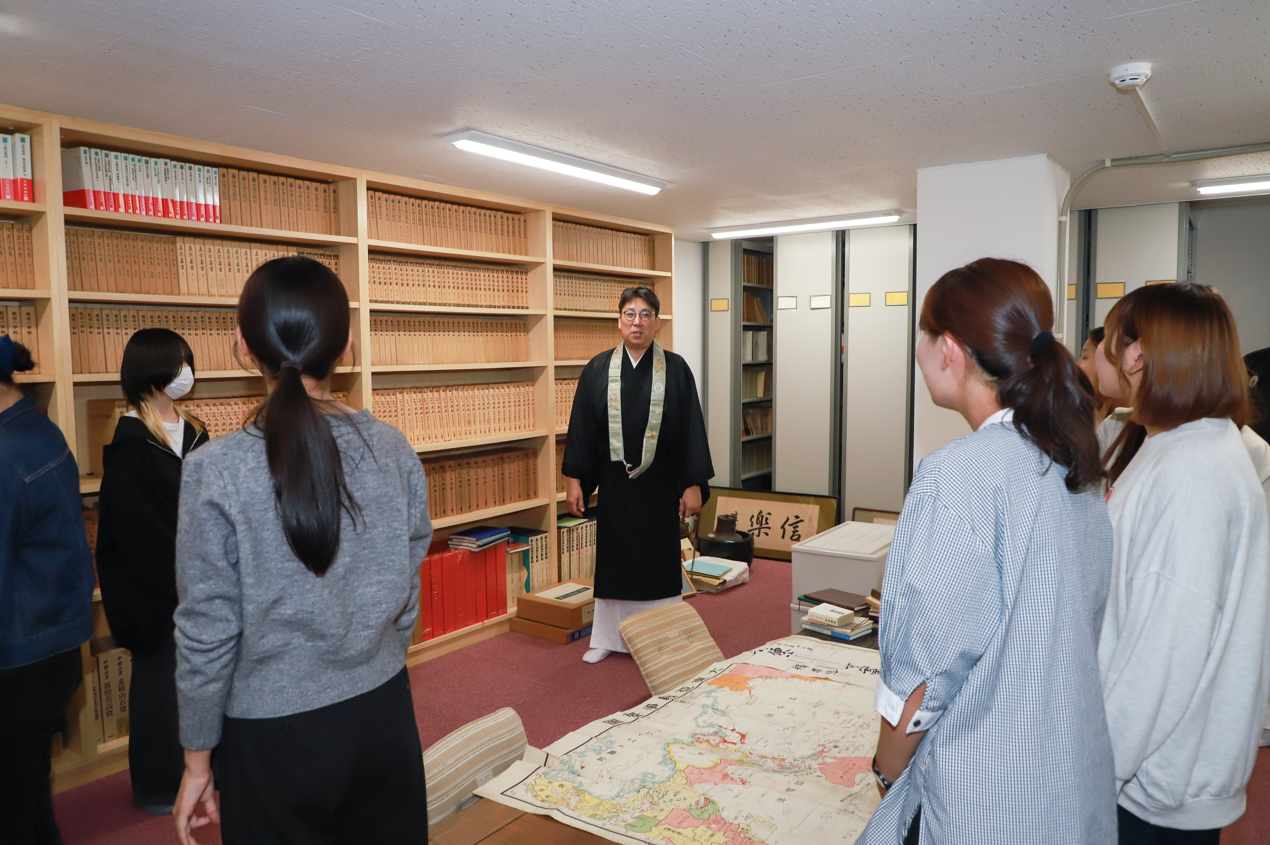 今回のフィールドワークでは、慈光寺住職・八力廣超氏のご案内のもと、境内や本堂、地下書庫を見学させていただいたほか、「開基百十年記念法要への参列」という特別な機会を経験しました。