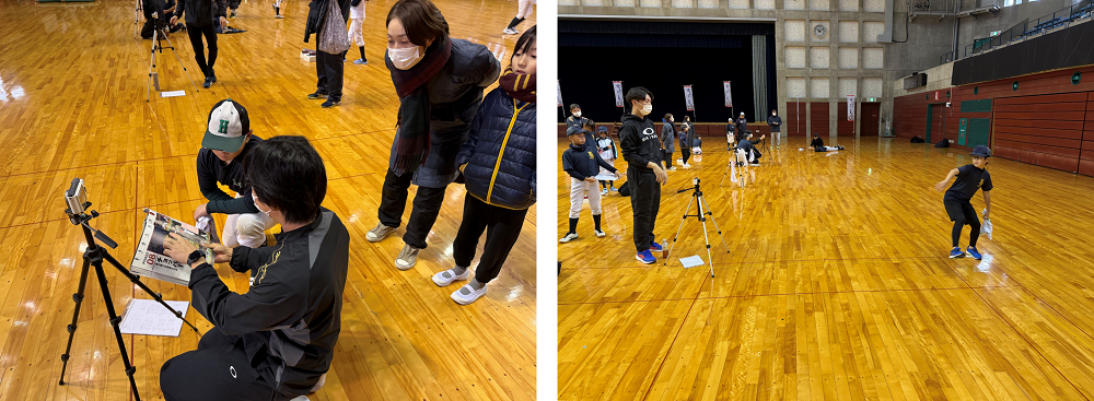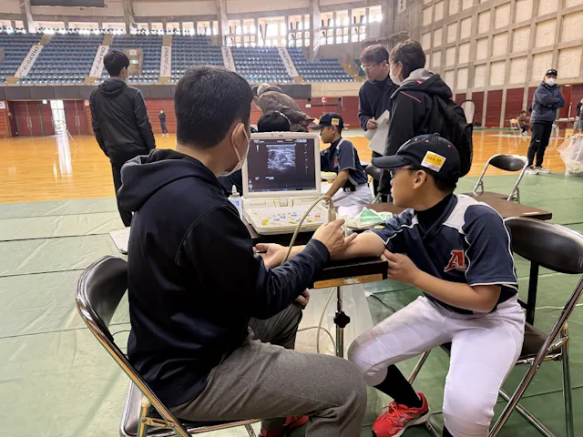 参加者は大学院医学系研究科保健学専攻の本郷道生教授、齊藤明准教授、照井佳乃助教、菊地翼助教、整形外科学講座の石垣佑樹先生、岩渕圭一郎先生、大曲整形外科クリニックのスタッフ(2名)、大学院生等(18名)、医学部医学科・保健学科理学療法学専攻の学生(8名)らが運営する12のブースを順番に周り、超音波による肘の障害の有無の確認、骨の発達状況、靭帯や筋肉の状態、筋力や関節角度、柔軟性などを計測し、現在の身体の状態を確認しました。またプロチームでも使用されているスピードガンを使用して球速測定、スイングスピードの測定を行いました。さらにハイスピードカメラを用いた投球フォームのチェック・指導、予防のためのストレッチ指導も実施しました。