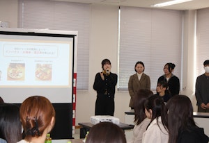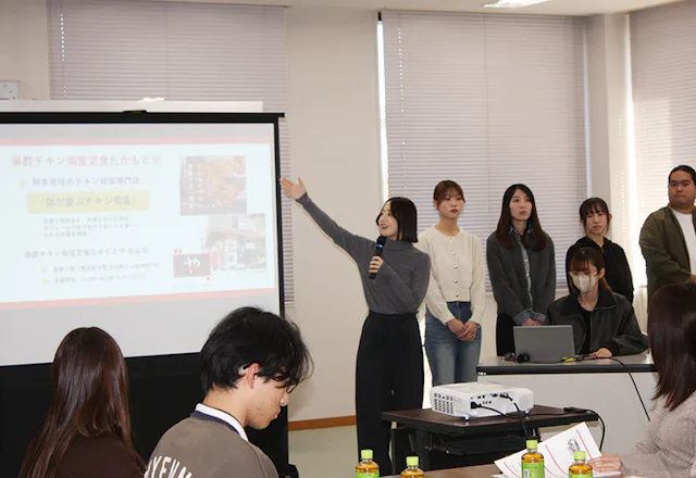 この報告会は、鹿児島市との連携事業「大学連携による繁盛店づくりコンサルティング事業」の一環で、黒酢チキン南蛮定食たかもとや鹿児島谷山店、PONGEE、BIGMOUTH Shokudo & Partyの3社を対象に実施。学生達はこれまでの現地視察やヒアリング、グループワークなどを通じた上で、マーケティングの視点を取り入れて考察した成果を3班にわかれて披露しました。
