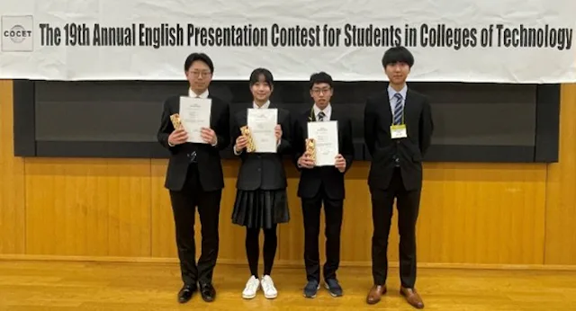 1月24~25日に東京で開催された「第19回全国高等専門学校英語プレゼンテーションコンテスト」にお いて、物質・生物系5年上杉陸人さん、土木・建築系2年吉田寛司さん、土木・建築系2年大木晴楓さんが「チーム部門」で審査員特別賞(COCET賞)に選ばれました。上杉さんは2年連続の受賞です。即席麵に対する秋田高専の学生や教員の意識調査の結果をまとめ「Know Your Noodles Before You Slurp」の題で発表しました。論理的な構成が高く評価され、ネイティブスピーカーによる質疑応答にもよどみなく答えることができました。
