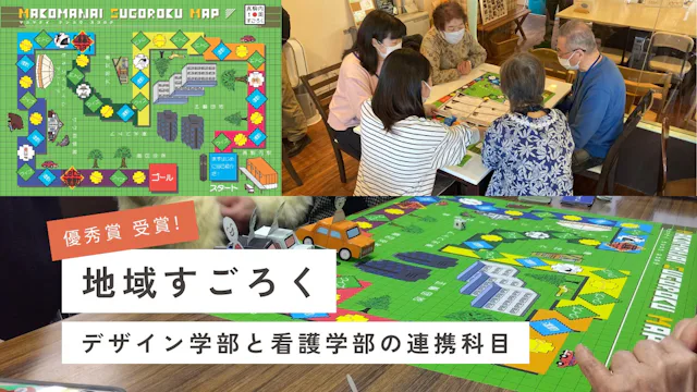 「地域すごろく」は、介護予防センターまこまないのアドバイスのもと、札幌市立大学のデザイン学部と看護学部の連携授業の中で作成されました。すごろくには「運動マス」、「クイズマス」、「トークマス」が設定され、楽しみながら運動や認知機能の向上、健康や地域に関する情報の習得、コミュニケーションの機会を確保できるのが特徴です。
