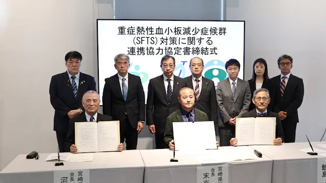 2025年12月23日(火)、宮崎大学、宮崎県医師会および宮崎県獣医師会は、重症熱性血小板減少症候群(SFTS)に関し、医学及び獣医学の両分野における専門的知見を相互に活用し、診断、治療、予防、啓発活動、研究等の取組を総括的かつ効果的に推進することにより、県民及び動物の健康保持と安全確保を図ることを目的として、連携協力協定を締結しました。