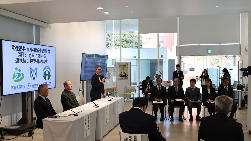 締結式において、鮫島浩学長は、「SFTSは人獣共通感染症であり、宮崎県の頭脳を結集して取り組む価値のある病気です。今回の協定締結を元にデータを蓄積して、世界に貢献していきたいと考えております」と今後の抱負を語りました。