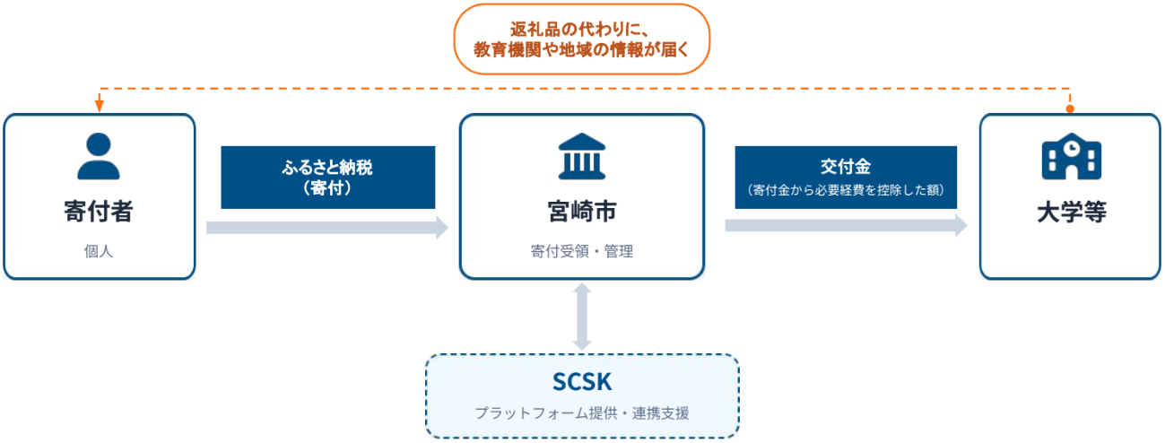 宮崎市は、地域教育を充実させ、ふるさとの未来に貢献するため、SCSK株式会社が運営する教育機関応援型のふるさと納税プラットフォームを導入します。このプラットフォームを通し、大学や地域に関心がある方々が繋がり、一体となって地域の成長・発展に取り組む未来を目指しています。